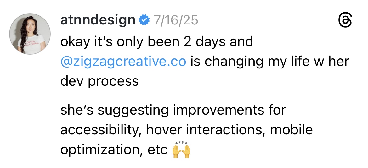 Once the design is approved, I’ll bring your website to life on your chosen platform (Squarespace, Webflow, or Shopify). At this stage, you’ll get 2 rounds of feedback on the completed design to make sure you walk away with a website worth bragging about.